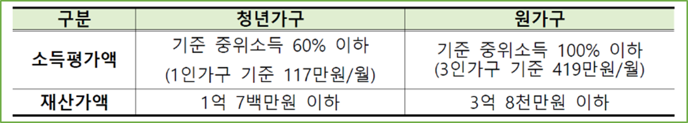 ▪ (소득요건) 청년가구 중위소득 60% 이하 & 원가구(부모+청년) 중위소득 100% 이하