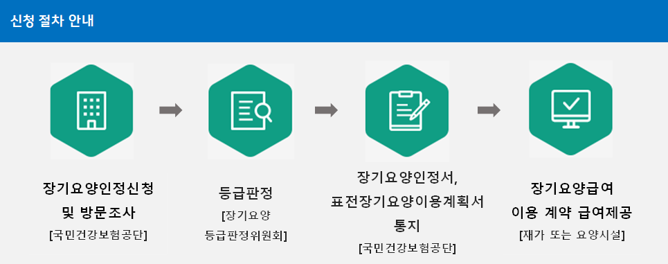 - 장기요양서비스를 이용하기 위해서 신청부터 등급판정까지 진행하는 절차입니다.