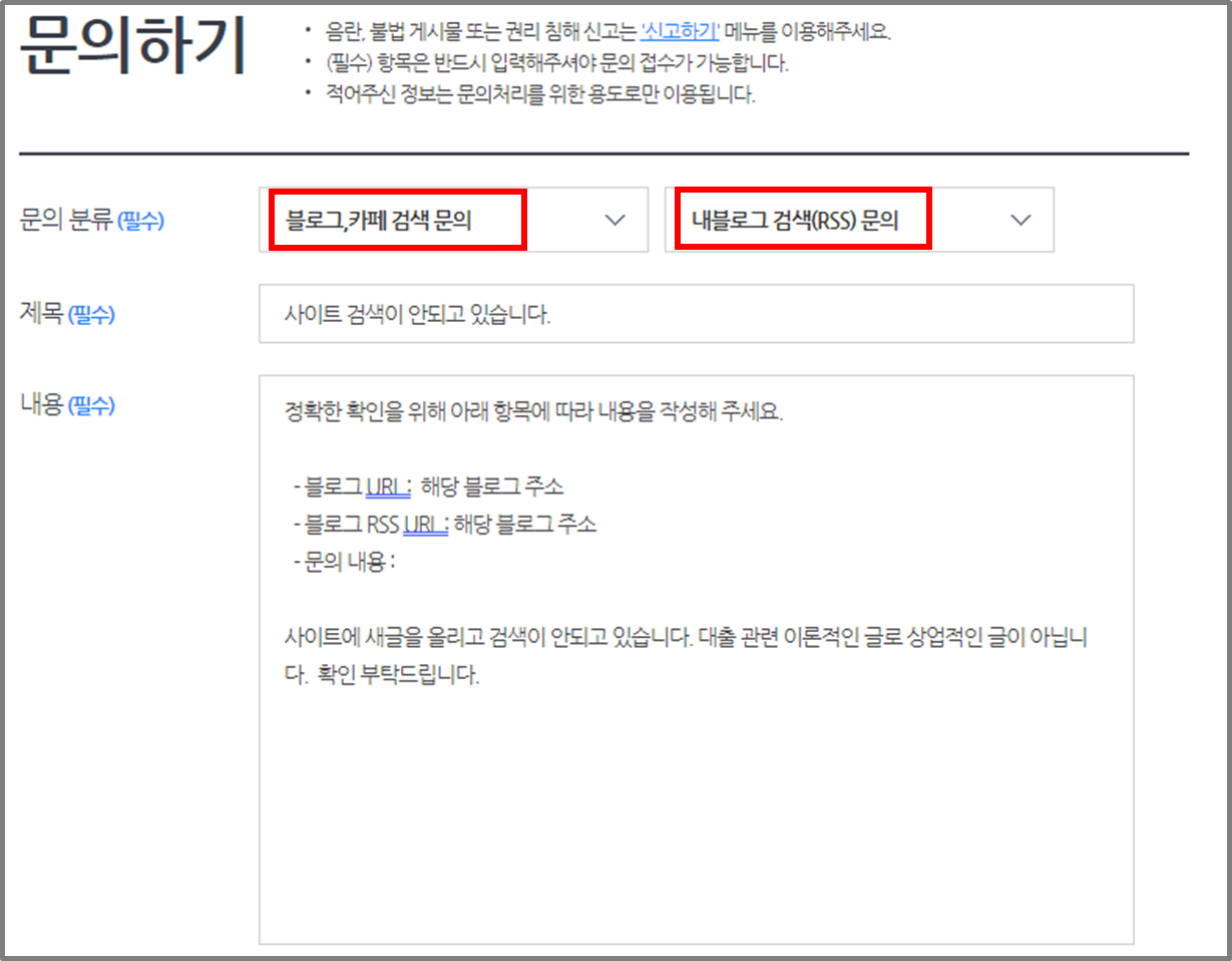 ⑥ 블로그, 카페, 검색문의 / 내블로그 검색(RSS)문의 선택후 내용 기재