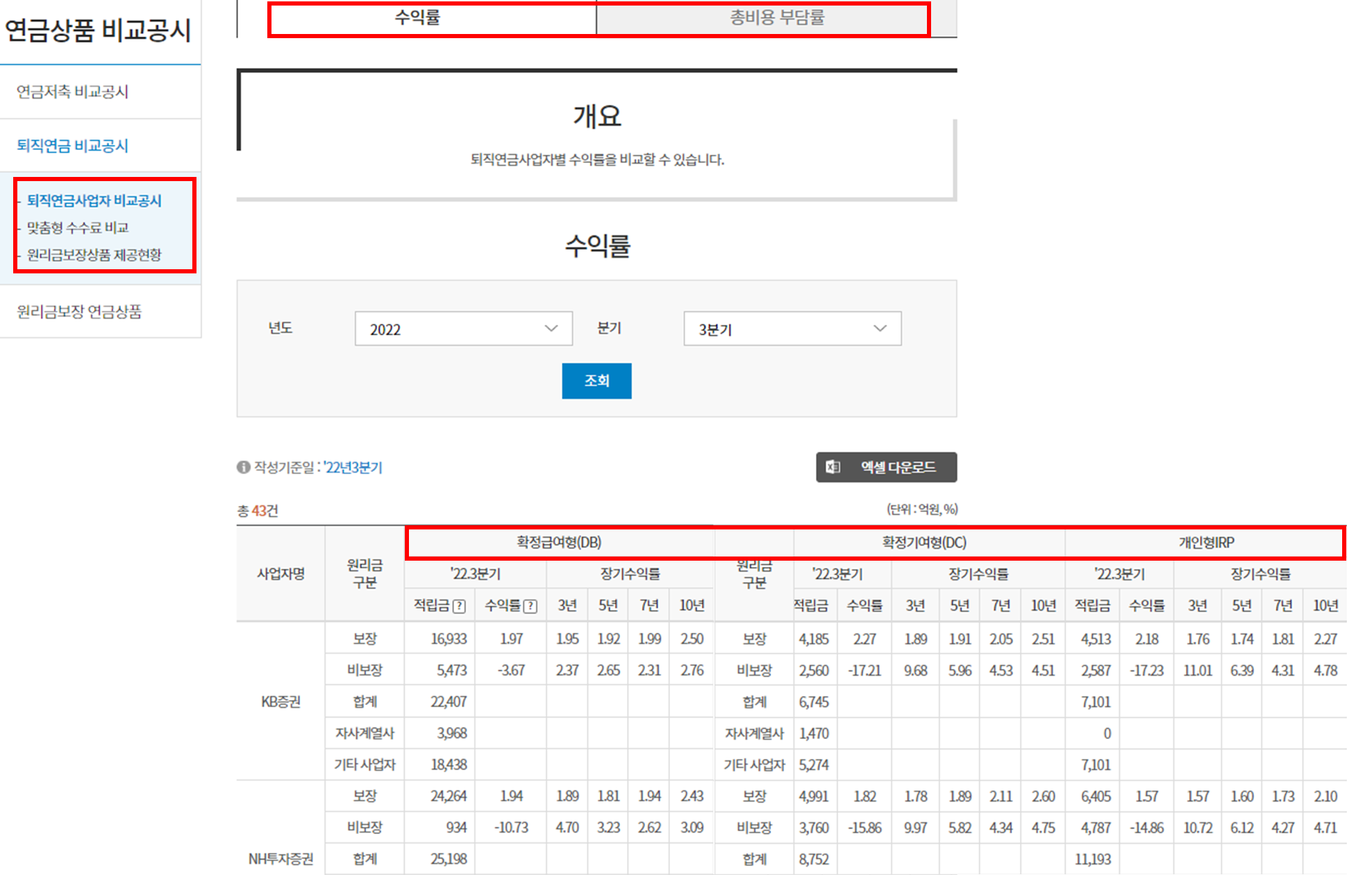 퇴직연금 사업자별로 수익률, 총비용부담금을 확정급여형(DB), 확정기여형(DC), 개인형IRP로 구분해서 공시 비교할수 있습니다.