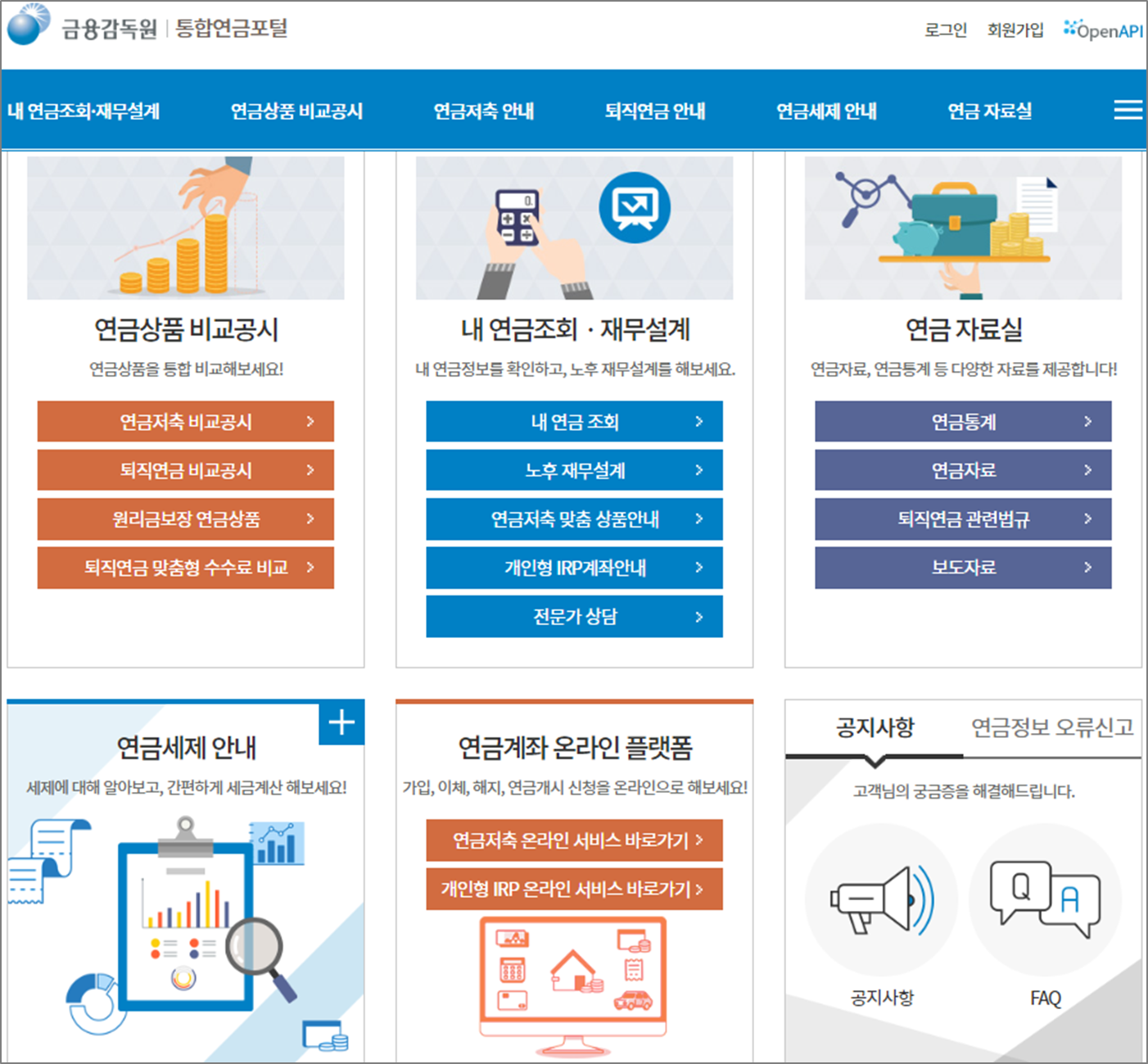 금융감독원을 통해 내가 가입한 국민연금, 퇴직연금(DB, DC, IRP), 개인연금, 추가연금 각각의 정보에 대해서 확인할 수 있습니다.