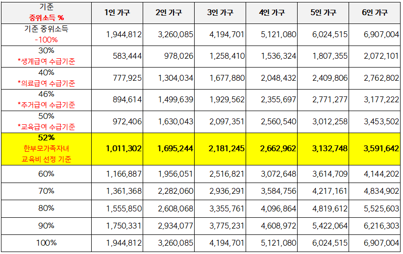 - 소득조건 : 월 소득인정액이 기준 중위소득의 52% 이내인 경우 지원