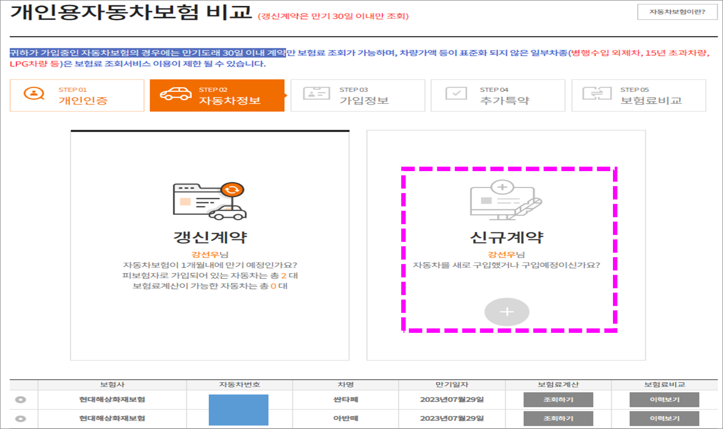 자동차보험 비교는 갱신과 신규건에 대해서 비교할수 있으며, 갱신은 만기 30일 이내만 조회가 가능합니다.